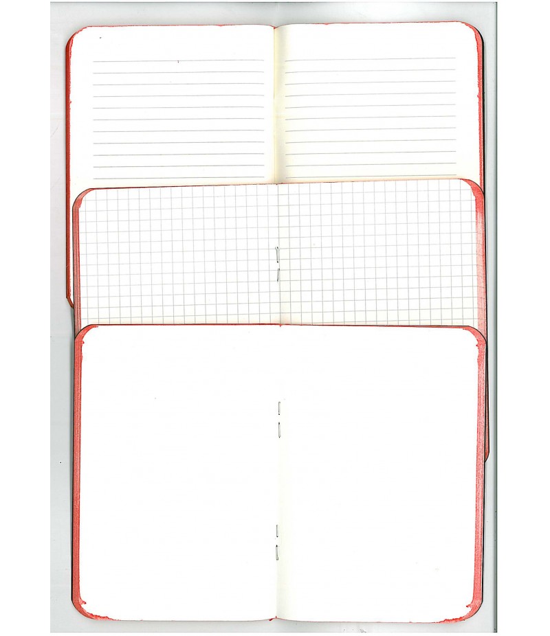 Quaderno con copertina rossa, bordo inchiostrato rosso. Formato 14 cm x 9,5 cm. Rigatura: pagina bianca.