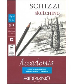 La carta da disegno Fabriano Accademia è prodotta con cellulosa di qualità senza lignina ed è senza acidi a garanzia di una lunga durata nel tempo. La sua collatura in massa e in superficie la rende resistente a ripetute cancellature. E' raccomandata per artisti e amatori che si dedicano agli schizzi e al disegno con matita, carboncino, pastello, matita colorata e inchiostro. 120gr/mq. Album da 50 fogli